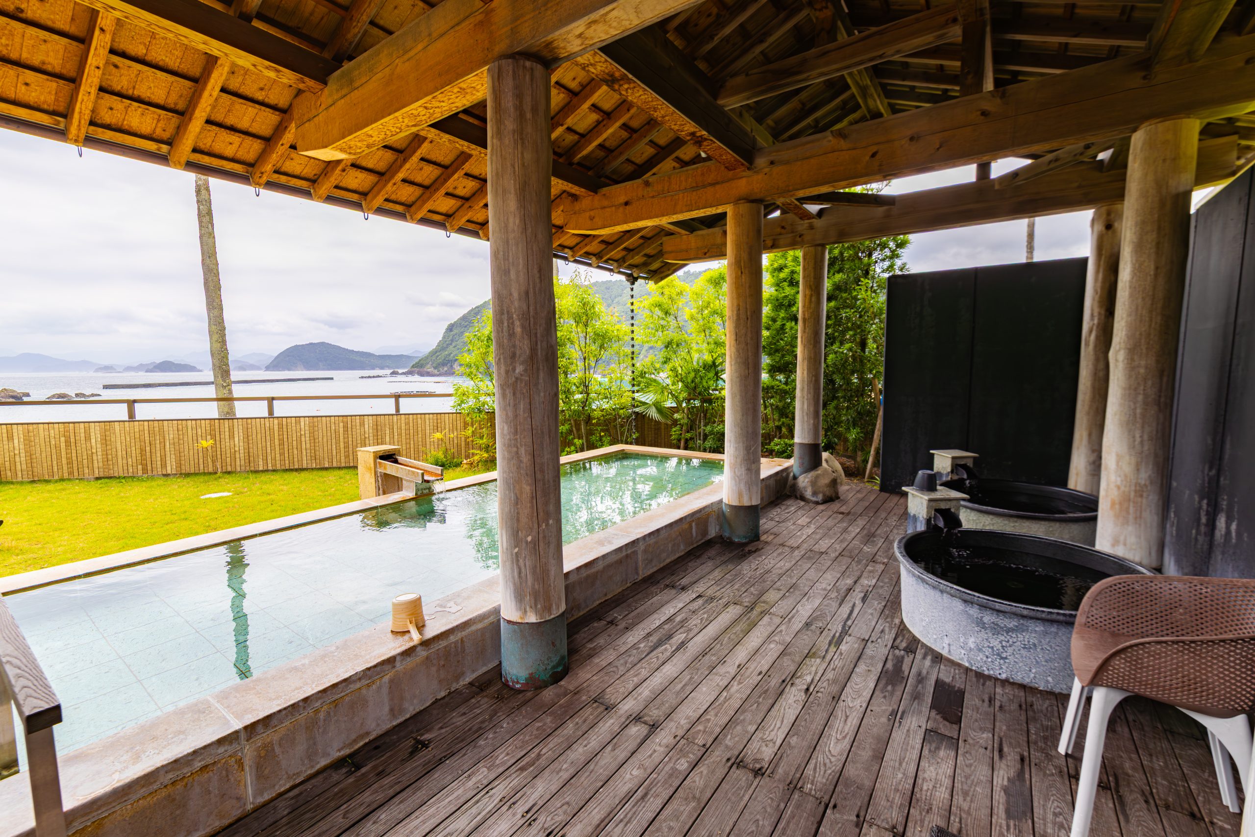 青い海と緑の山々、夜には星空を眺めながら過ごせる露天風呂は最高です。