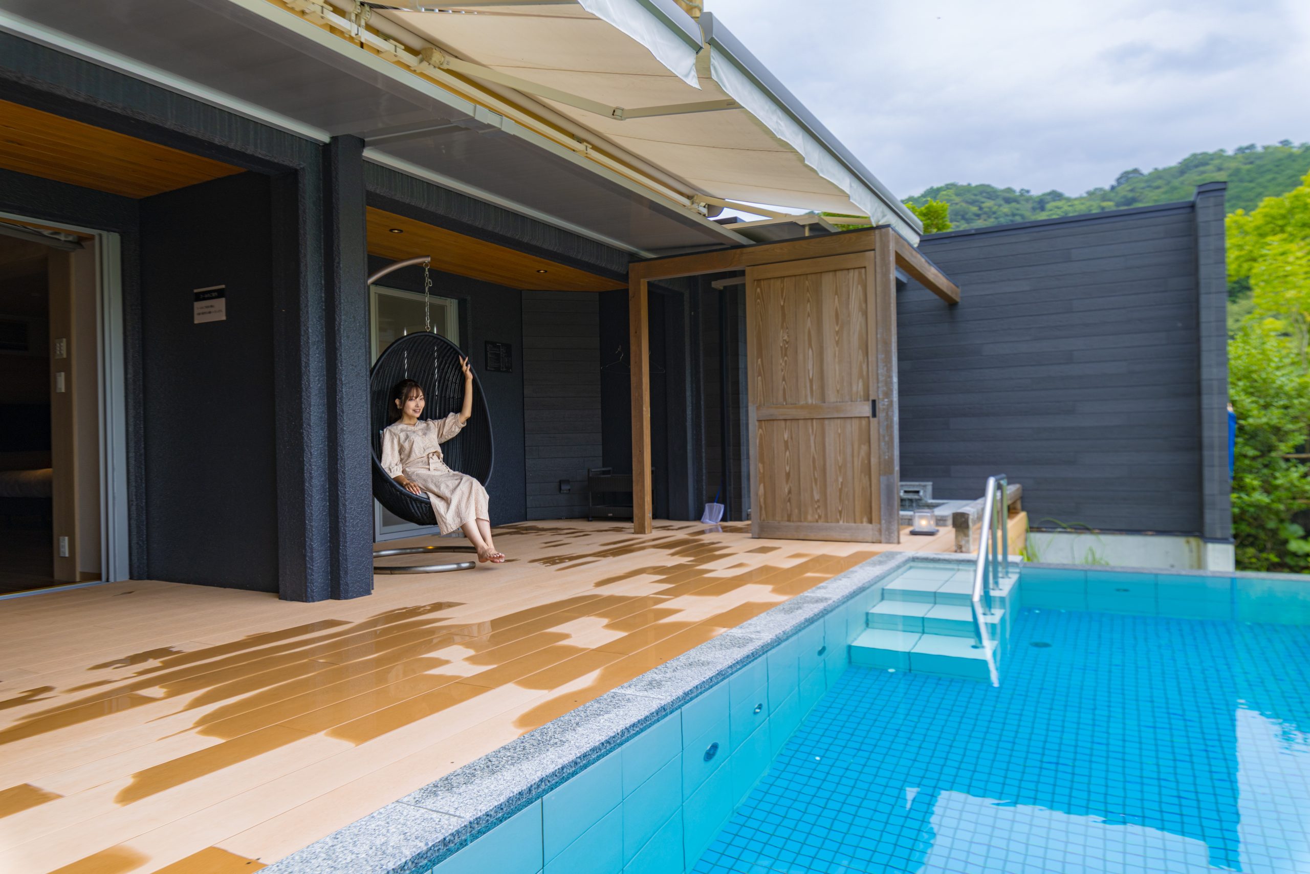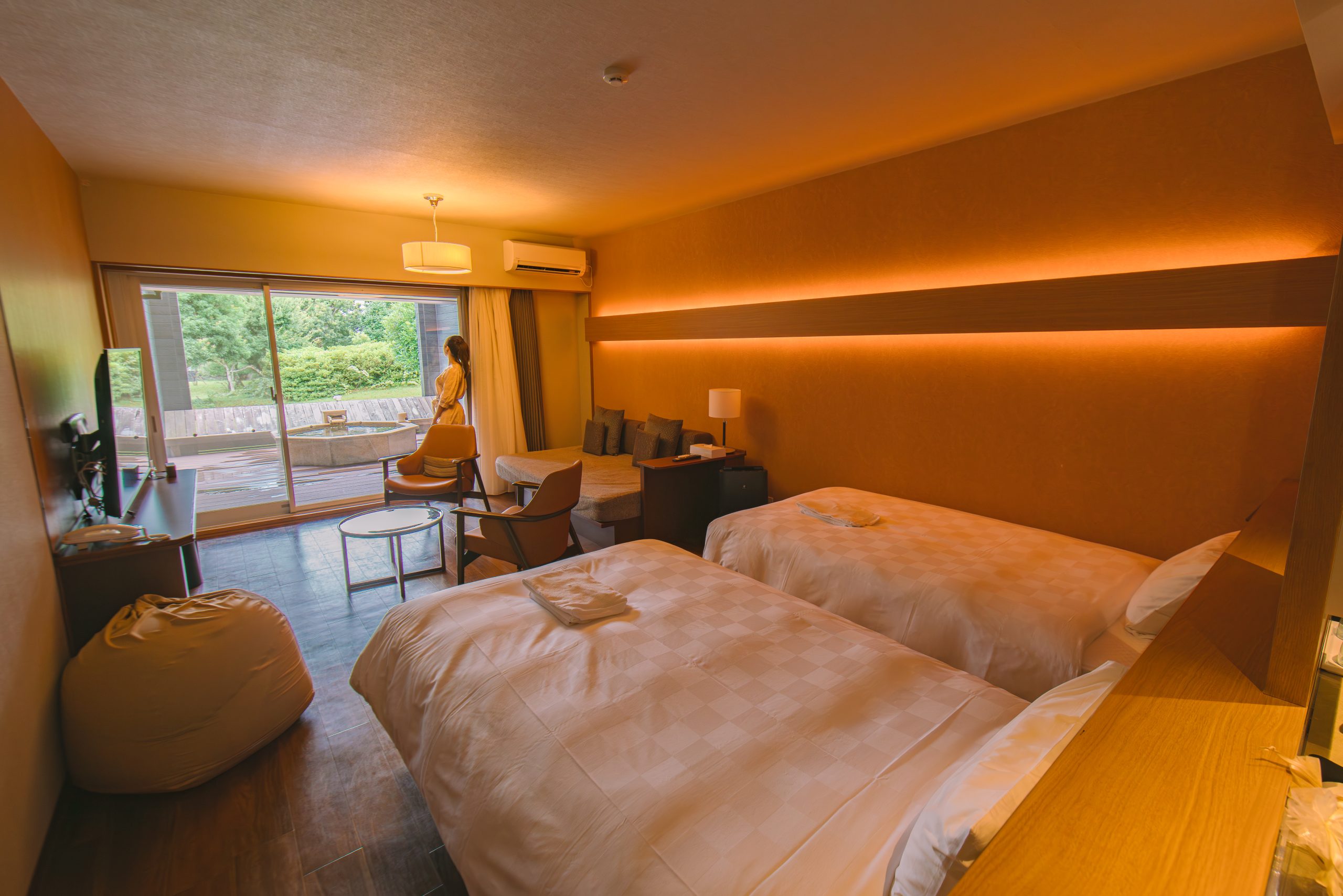 そしてさらに贅沢な、露天風呂に加え温水プールの付いたラグジュアリールーム。こちらは2部屋分もの広さがあり、最大5名で利用できます。