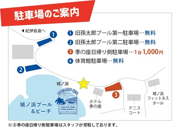 駐車場は、最も近いホテル「季の座(ときのざ)」の日帰り駐車場。シーズン中は1台1,000円の利用料金が発生します。