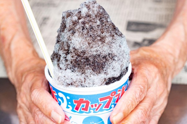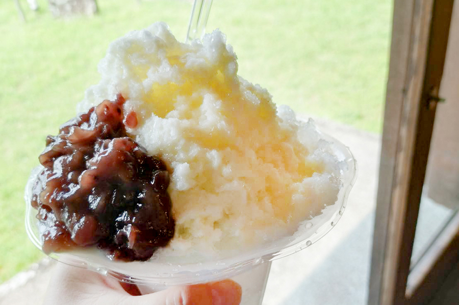 夏のおすすめはかき氷。キーンとしっかり冷たい食感なので、外で食べるのもオススメ。ミルク金時は甘めの味わいで、中まであんこがギッシリ!大きめなので、シェアでどうぞ。他にはいちご、ブルーハワイ、マンゴーの4種類です。