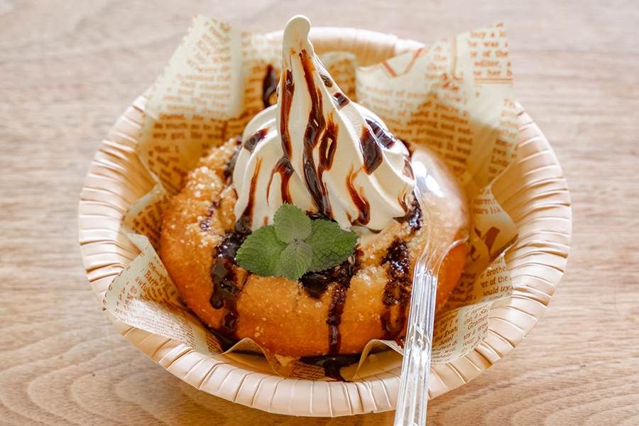いちおしのメニューはクリームドーナツ。注文をいただいてから揚げるサクサクドーナツに砂糖をまぶし、濃厚なソフトクリームをトッピング。チョコソースがアクセントになっていて、いろんな味を一緒に楽しめて、ペロリと食べられます。