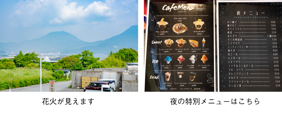 夢古道おわせのテラス席で花火を見ながらひんやりメニューを食べたり、お酒を飲んだり、温泉で一息ついたり。花火を遠くから眺めて過ごすのもおすすめですよ。