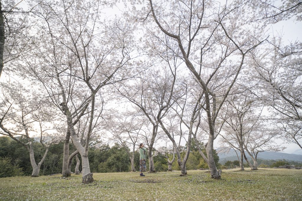 広場一帯が淡い桜色に包まれる始神さくら広場は、開放感あふれるお花見スポット。
