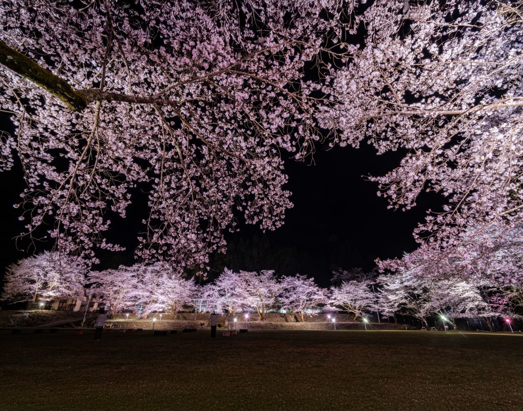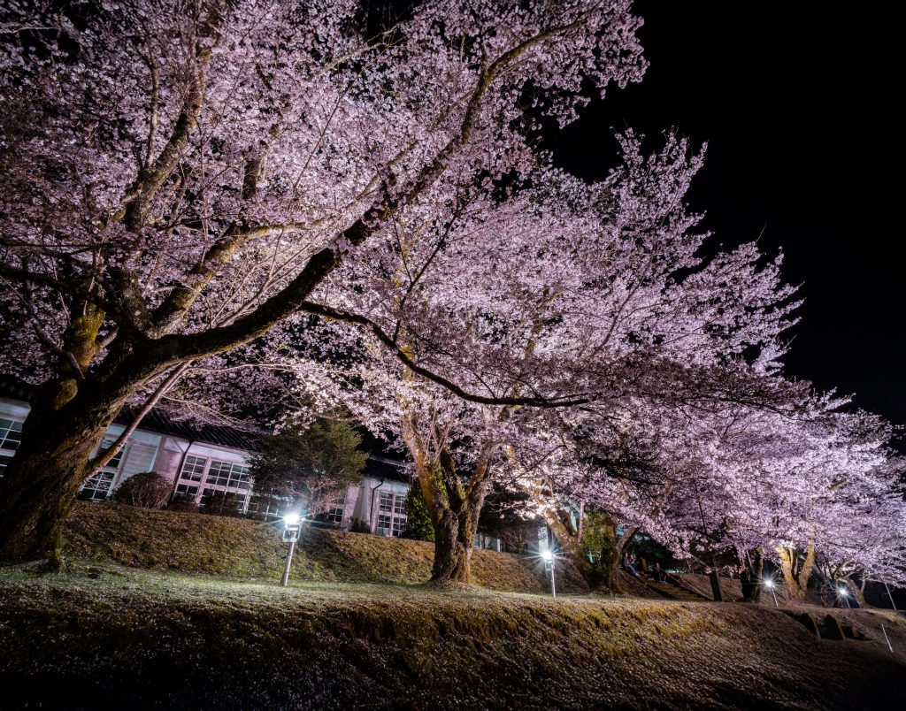 ここ、旧神上中学校で行われる夜桜のライトアップは圧巻の景色!